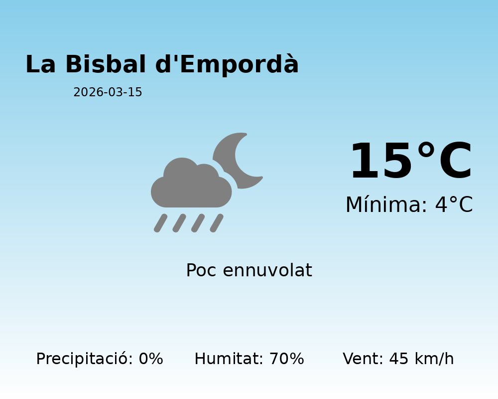 El cel es presentarà parcialment ennuvolat (codi d’estat cel: 12), amb intervals de núvols que no haurien d’evolucionar en precipitacions significatives. És un bon moment per activitats a l’exterior aprofitant la llum solar disponible.