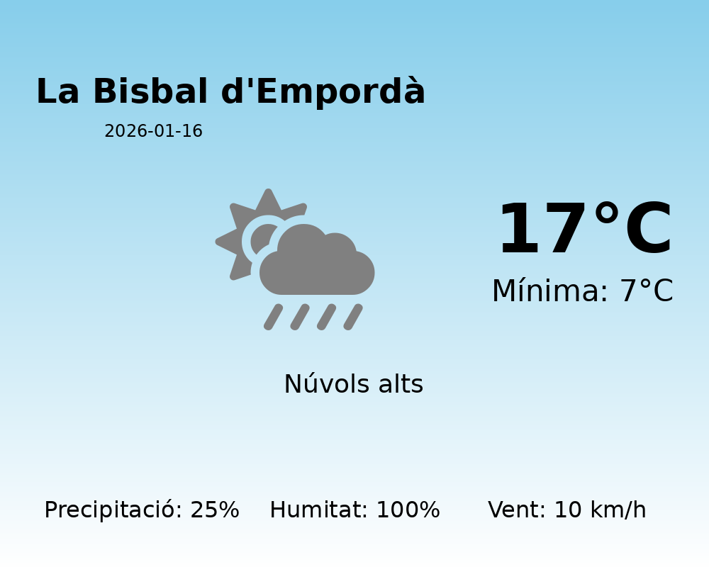 El cel es mantindrà cobert durant la major part del dia, amb una cobertura de núvols significativa. Les precipitacions estan previstes al 25%, per la qual cosa serà aconsellable portar impermeable o paraigua. Cal estar preparats per a possibles estones de pluja.