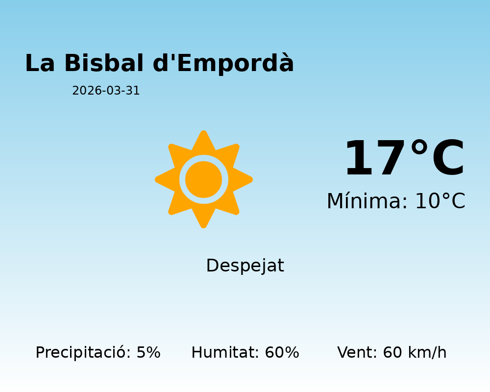 En resum, avui a La Bisbal d’Empordà ens espera un dia variat amb núvols predominants, alguna precipitació i vent moderat. Prepareu-vos amb roba adequada i consulteu regularment actualitzacions meteorològiques per a possibles canvis en les condicions.