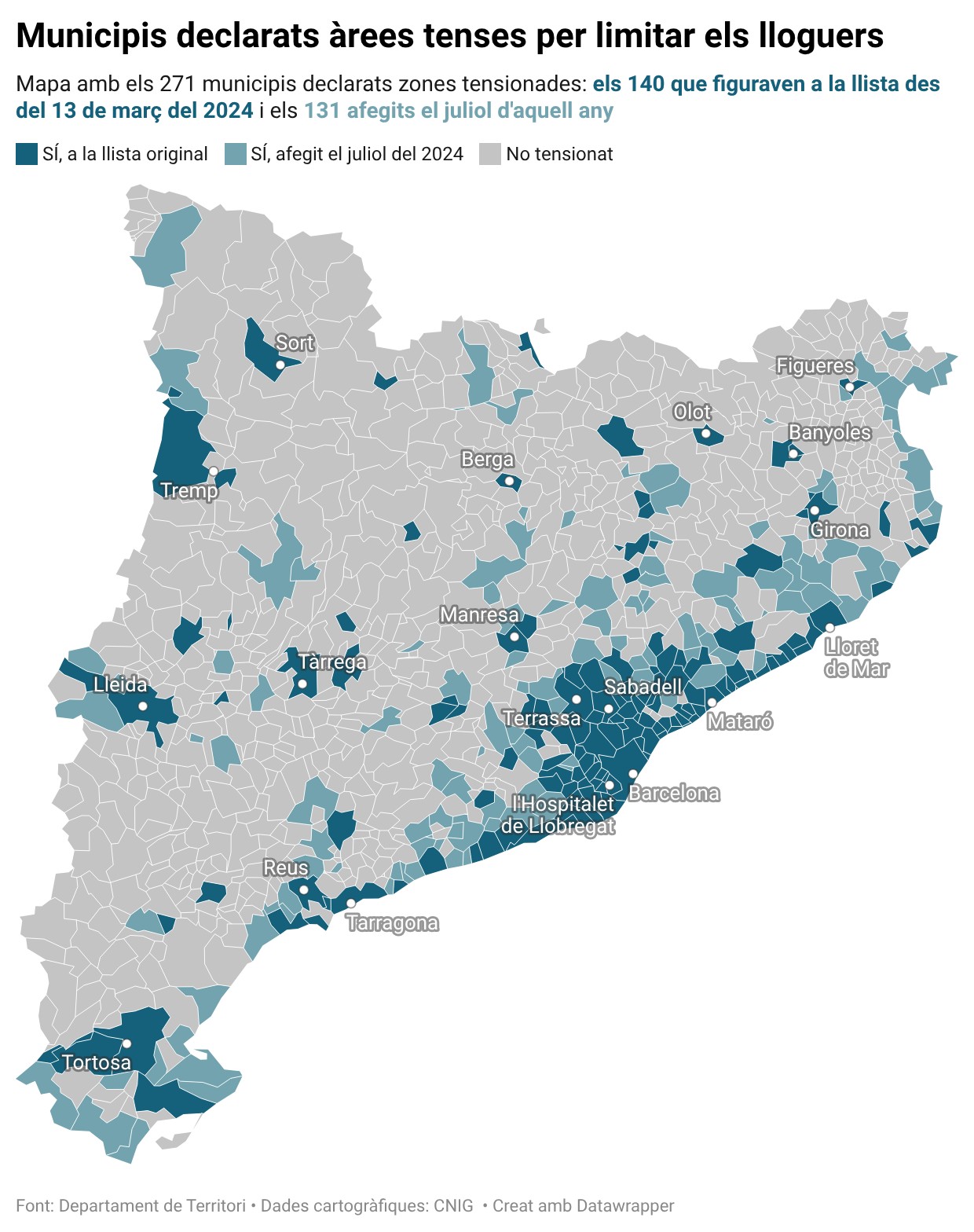 Ara, però el document elaborat per la Generalitat aclareix que aquests cinc immobles hauran d’estar situats en una de les dues zones declarades per considerar-se gran tenidor. A la primera zona hi ha pràcticament totes les localitats de l’àmbit metropolità de Barcelona; les quatre capitals, part de les comarques costaneres i d’altres de muntanya com Ripoll, Puigcerdà, Mollerussa, Solsona o Torelló, entre d’altres. A la segona s’hi inclouen localitats com Vielha, Cadaqués, Begur, Besalú o Altafulla, entre d’altres.