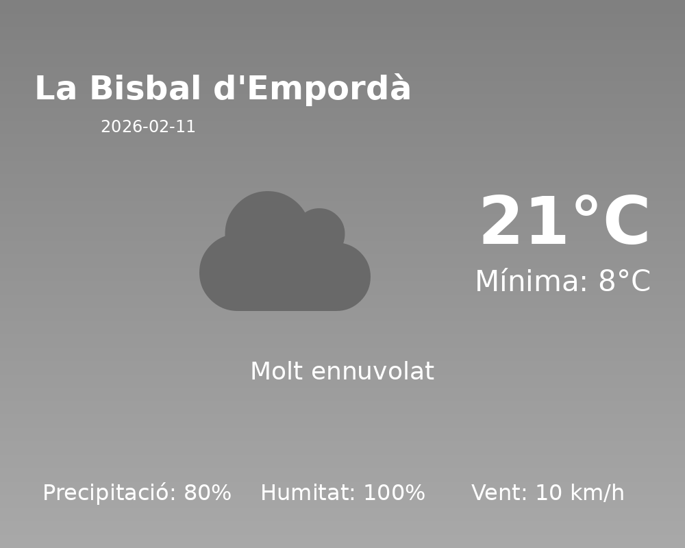 Avui, la ciutat de La Bisbal d’Empordà experimentarà un clima força variable. Prepareu els vostres paraigües i roba adequada, ja que la precipitació estimada per avui és del 80%.