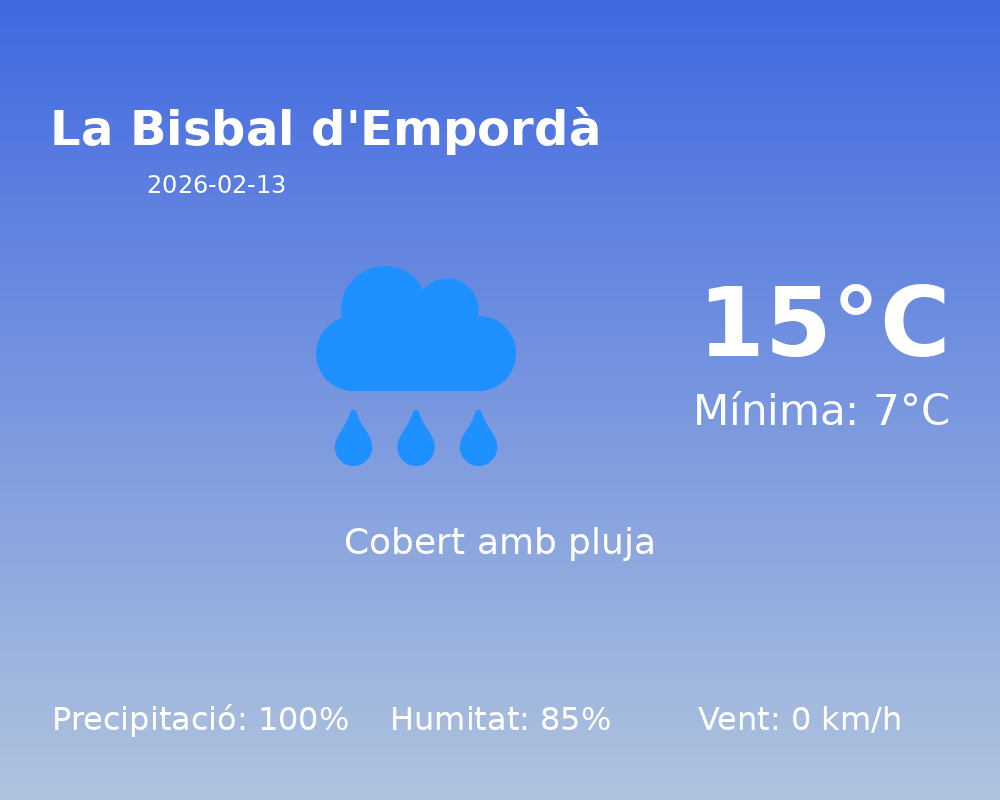 Avui, La Bisbal d’Empordà experimentarà un dia amb condicions meteorològiques marcades per la presència de pluges. Segons les dades disponibles, hi ha una probabilitat de precipitació del 100%, cosa que suggereix que serà un dia passat per aigua. Us recomanem que porteu el paraigua si heu de sortir.
