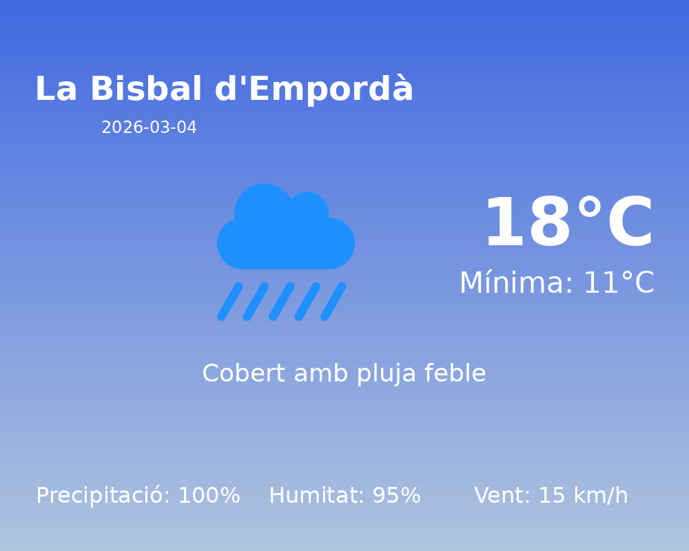 Avui a La Bisbal d’Empordà, esperem una jornada marcada per la presència de núvols i alta probabilitat de precipitacions. El cel estarà cobert amb nivells de núvols indicatius de l’estat “46”. Això es tradueix en una visibilitat reduïda i un ambient gris durant gran part del dia.