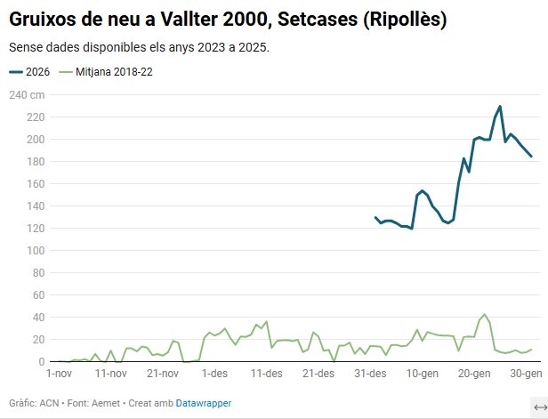 Vallter és un tercer exemple de la magnitud excepcional de les nevades aquest any al Pirineu més oriental, a la comarca del Ripollès. El 25 de gener l’estació de l’Aemet hi mesurava 230 centímetres. La mitjana de neu acumulada aquest dia entre els anys 2018 i 2022 és irrisòria al costat d’aquesta xifra: tan sols 9 cm de neu.