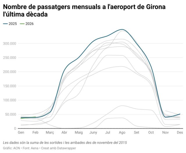 ACN Vilobí d’Onyar – L’aeroport de Girona ha tancat el mes de febrer amb 41.011 passatgers, un 5,6% respecte al mateix mes de 2025, segons el balanç mensual elaborat per Aena. En el que portem d’any, l’aeroport ha registrat 76.473 passatgers, un 1,3% menys que en el mateix període de l’any passat. Pel que fa als moviments, la terminal de Vilobí d’Onyar ha operat un 14,4% més de vols (1.361) i ha registrat 2.653 operacions, un 4,7% més que en el mateix període de l’any passat. Les dades suposen una millora respecte de les registrades al gener, quan l’aeroport va patir un descens del 8,2% respecte al mateix període de l’any passat amb un total de 35.462 passatgers.