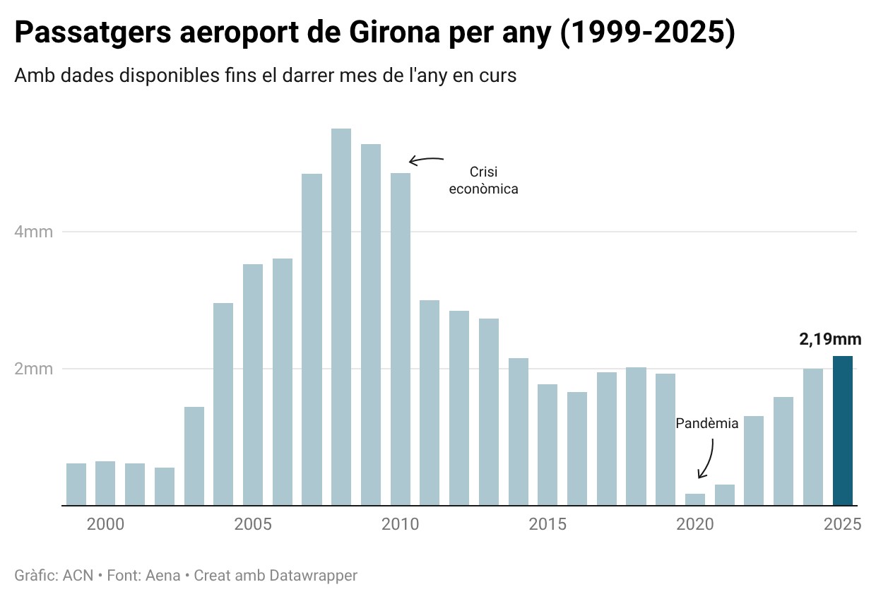 ACN Vilobí d’Onyar – L’aeroport de Girona ha tancat el millor any des del 2013 en volum de passatgers, després d’arribar als 2.185.561 usuaris el dia 31 de desembre. Es tracta d’un dels objectius que tenia la taula estratègica de l’aeroport pel 2025 i suposa un augment de passatgers del 9,4% en comparació amb l’any anterior. Pel que fa al volum d’operacions, s’han fet 28.000 aterratges i enlairaments al llarg de tot l’any, que suposa un increment del 15,2% de l’activitat en comparació amb el 2024. En concret, les dades del desembre han permès afegir 51.000 passatgers al còmput global de tot l’any. Aquesta xifra suposa un 4,6% més dels que hi havia a l’anterior any.