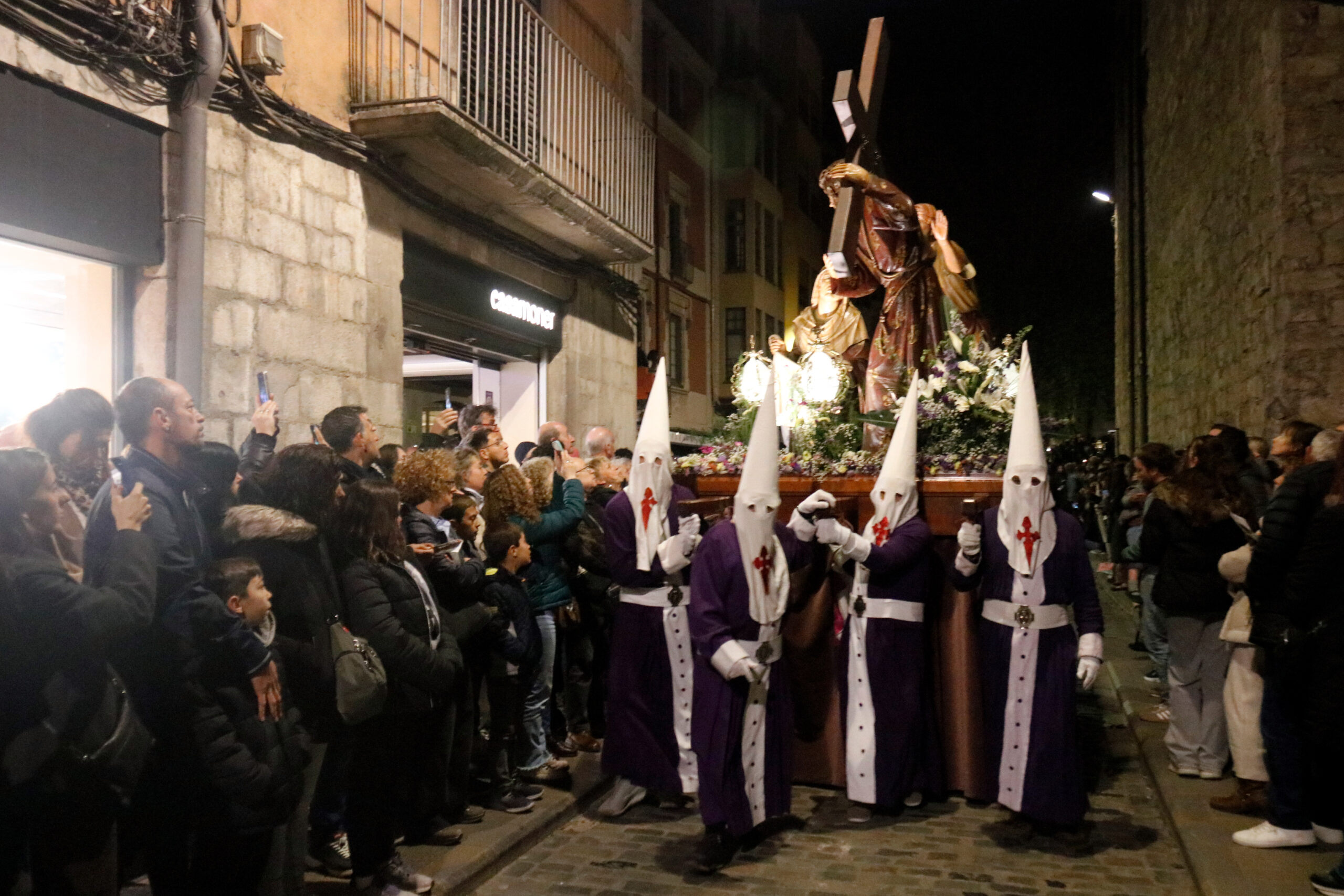 Amb les vestes i caputxes, els i les confrares han tornat a dur pels carrers -sobretot, del Barri Vell- els passos que narren la història bíblica de la Passió de Crist. Sota la llum de les espelmes, els fidels i curiosos han anat veient passar les diferents escenes. Des de la que representa l’entrada triomfal a Jerusalem fins al Sant Sepulcre, passant per les imatges de l’Últim Sopar, la Caiguda, l’Ecce Homo, la trobada de Jesús amb la Verge Maria camí del Calvari, la Crucifixió o el Davallament.