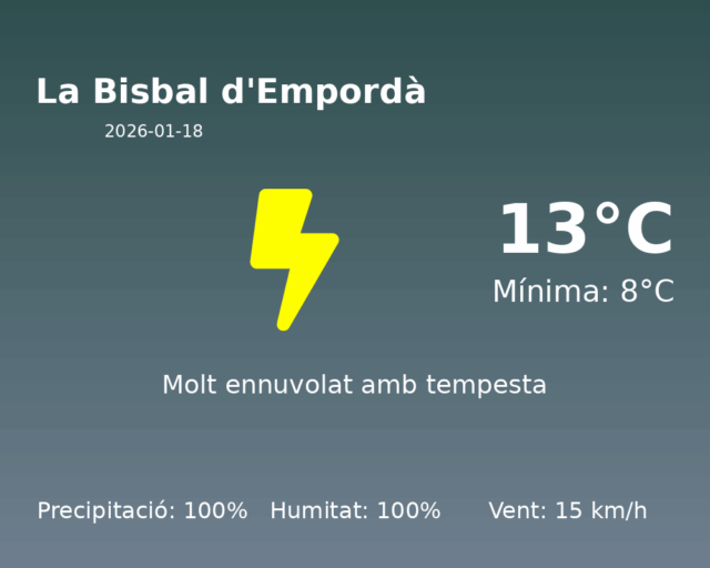 Avui el temps a La Bisbal d’Empordà presenta característiques marcadament humides i plujoses. Amb una temperatura màxima de 13°C i una mínima de 8°C, el dia es mantindrà fresc i molt humit.