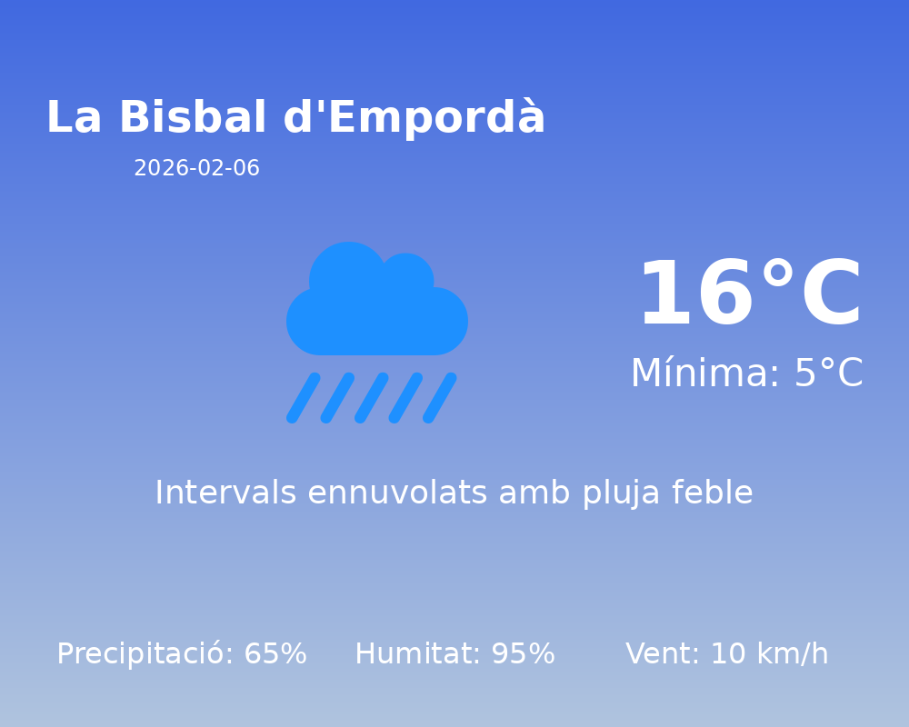 En resum, el temps avui a La Bisbal d’Empordà estarà marcat per unes condicions humides i fresques, amb una alta probabilitat de pluja. Recomanem preparar-se adequadament per afrontar el dia de manera confortable.
